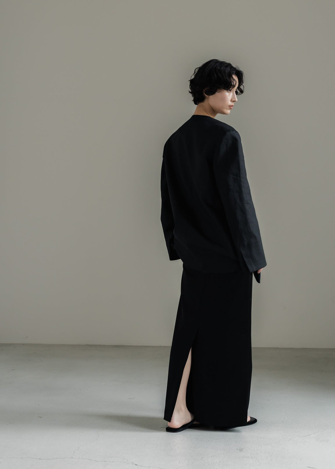 後ろに入れたベンツ開き(スリット)は、動きやすさを確保しながらも控えめな開き具合で、上品な印象をキープ。