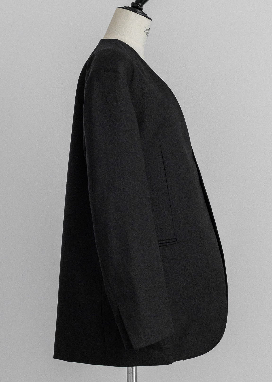 無駄を削ぎ落としたクリーンなシルエットが魅力のノーカラージャケット。